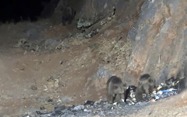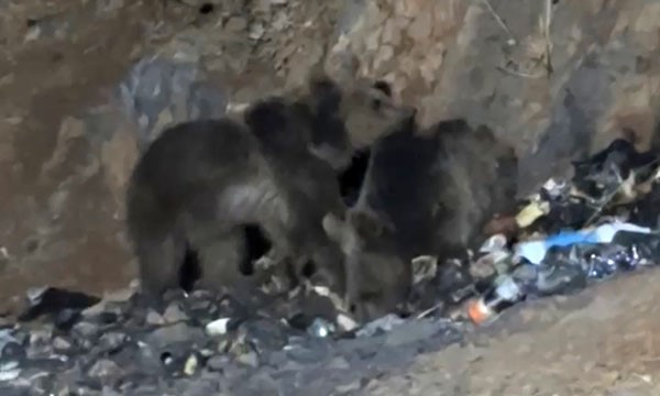 Hakkari’nin Yüksekova ilçesine bağlı Dağlıca köyü yakınlarındaki bir yol yapım şantiyesinde aç ayılar görüntülendi. Gece saatlerinde yiyecek aramak için şantiye çöplüğüne inen ayılar, çevredeki çöp poşetlerini karıştırarak besin aradı.