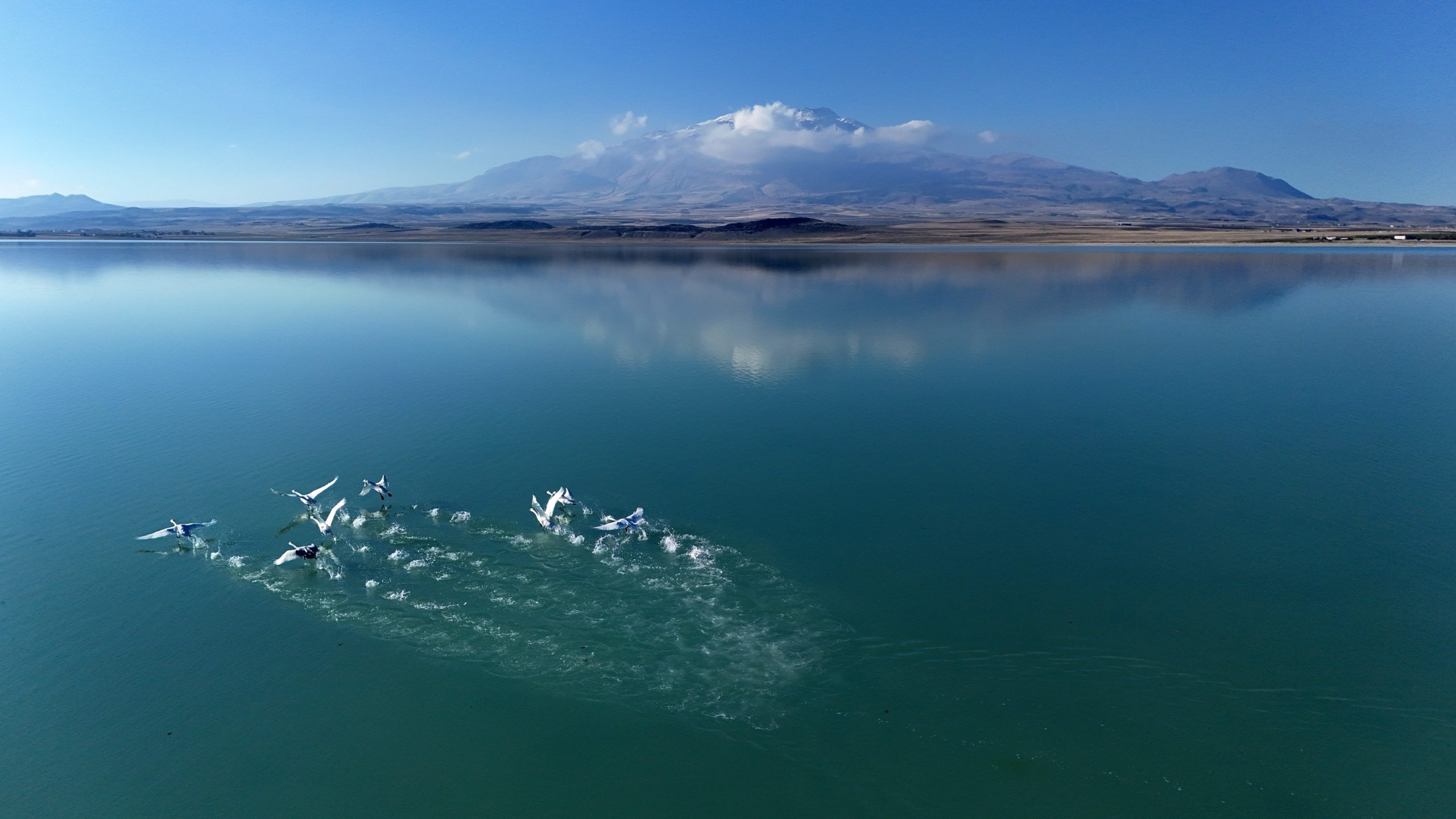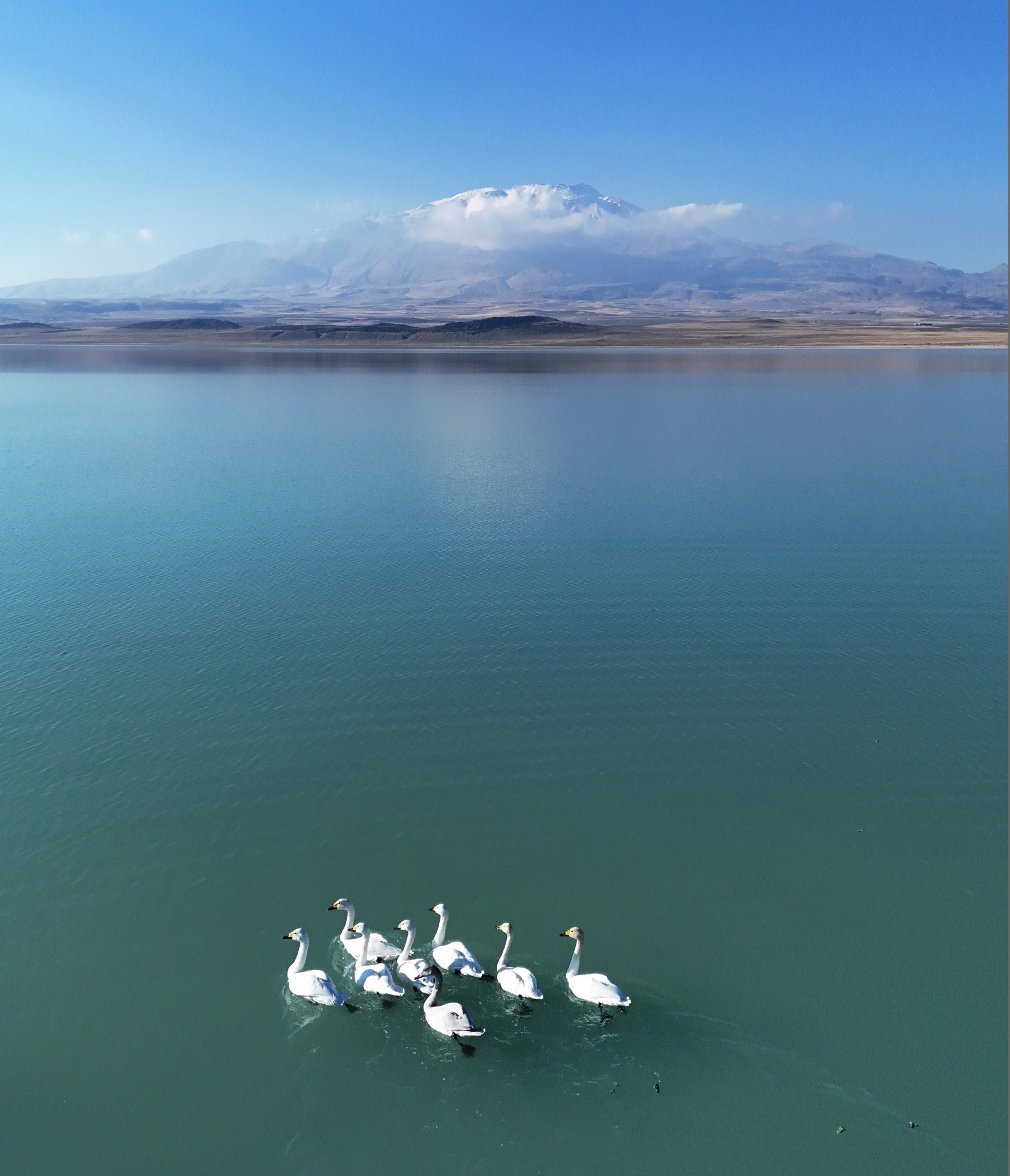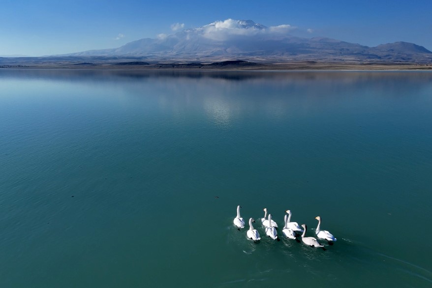 Dronla kaydedilen görüntülerde, berrak göl yüzeyinde süzülen kuğuların arka planında yükselen ve zirvesi karla kaplı Süphan Dağı yer aldı. Kuğularla dağın aynı karede buluştuğu görüntüler, doğaseverlerin hayran kaldığı kartpostallık manzaralar oluşturdu.