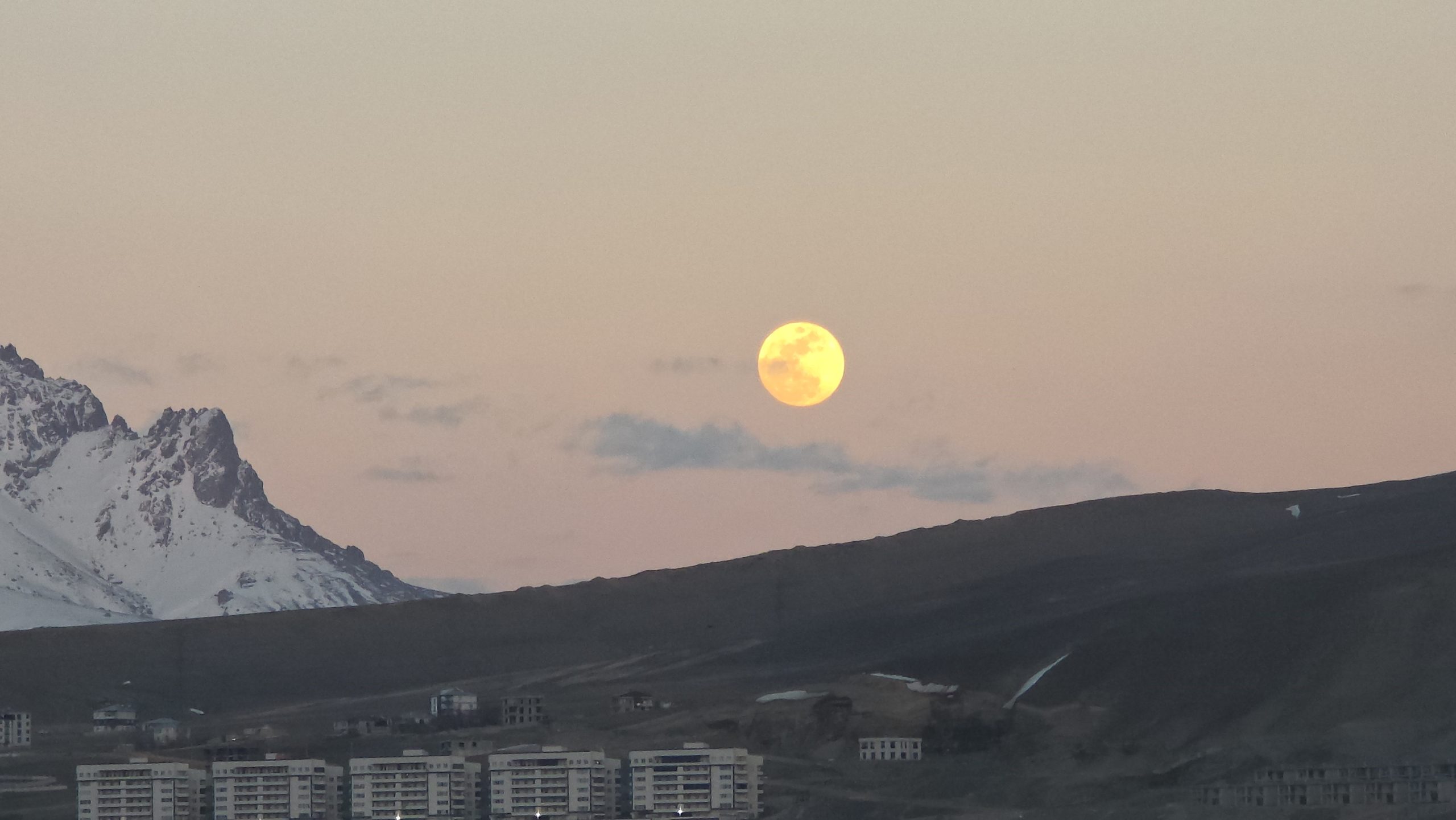 Van’ın doğusunda yer alan 3 bin 204 rakımlı Erek Dağı, akşam saatlerinde yılın ilk bahar dolunayına ev sahipliği yaptı. “Pembe dolunay” olarak adlandırılan gökyüzü olayı, kentin sakinleri tarafından ilgiyle izlendi.