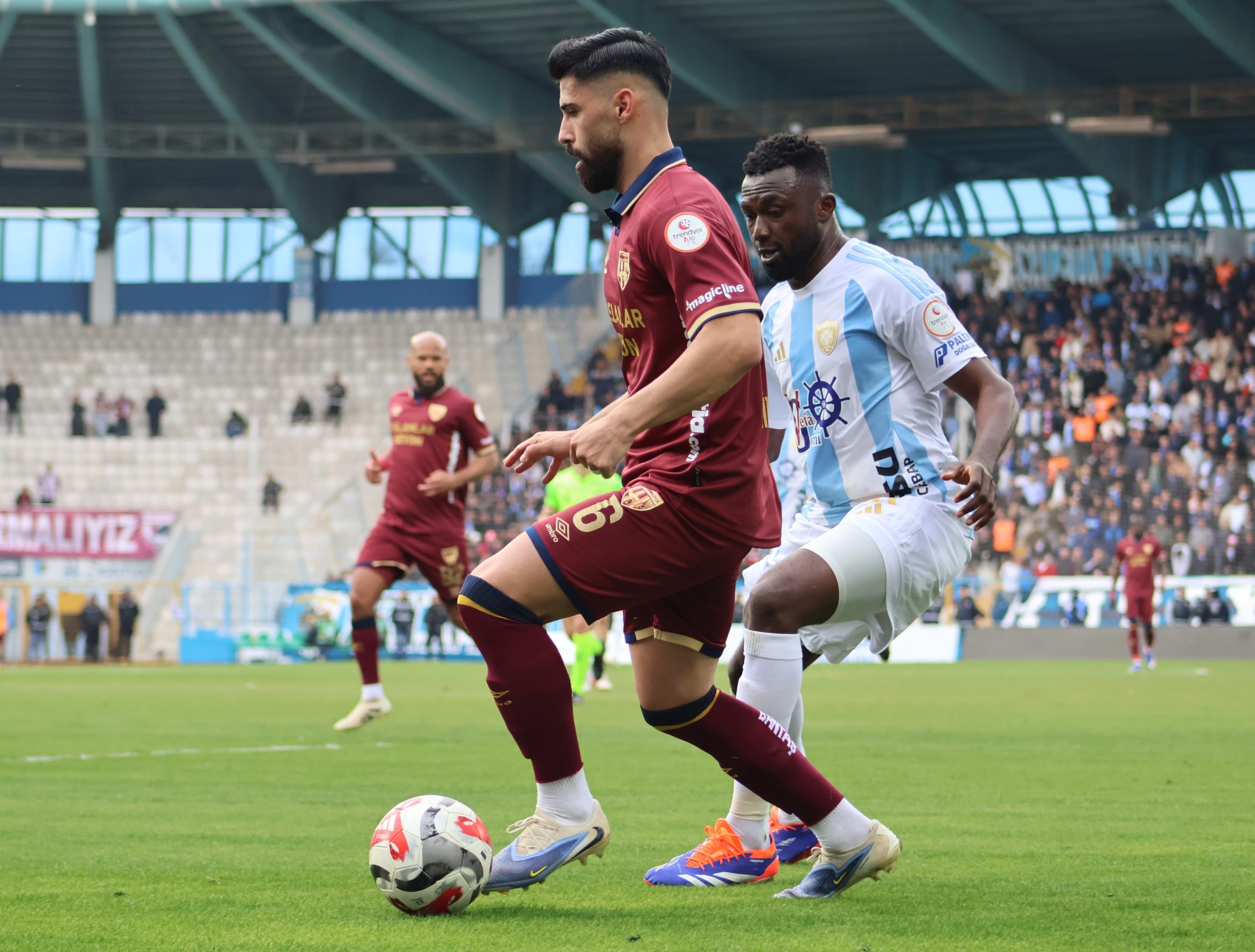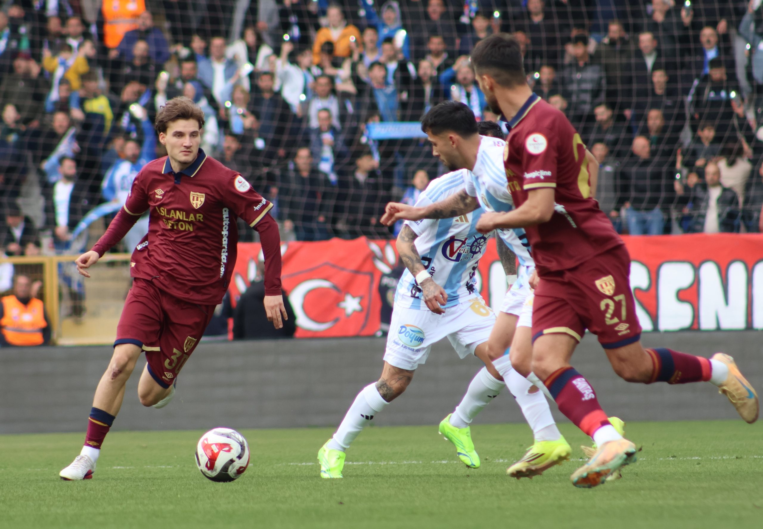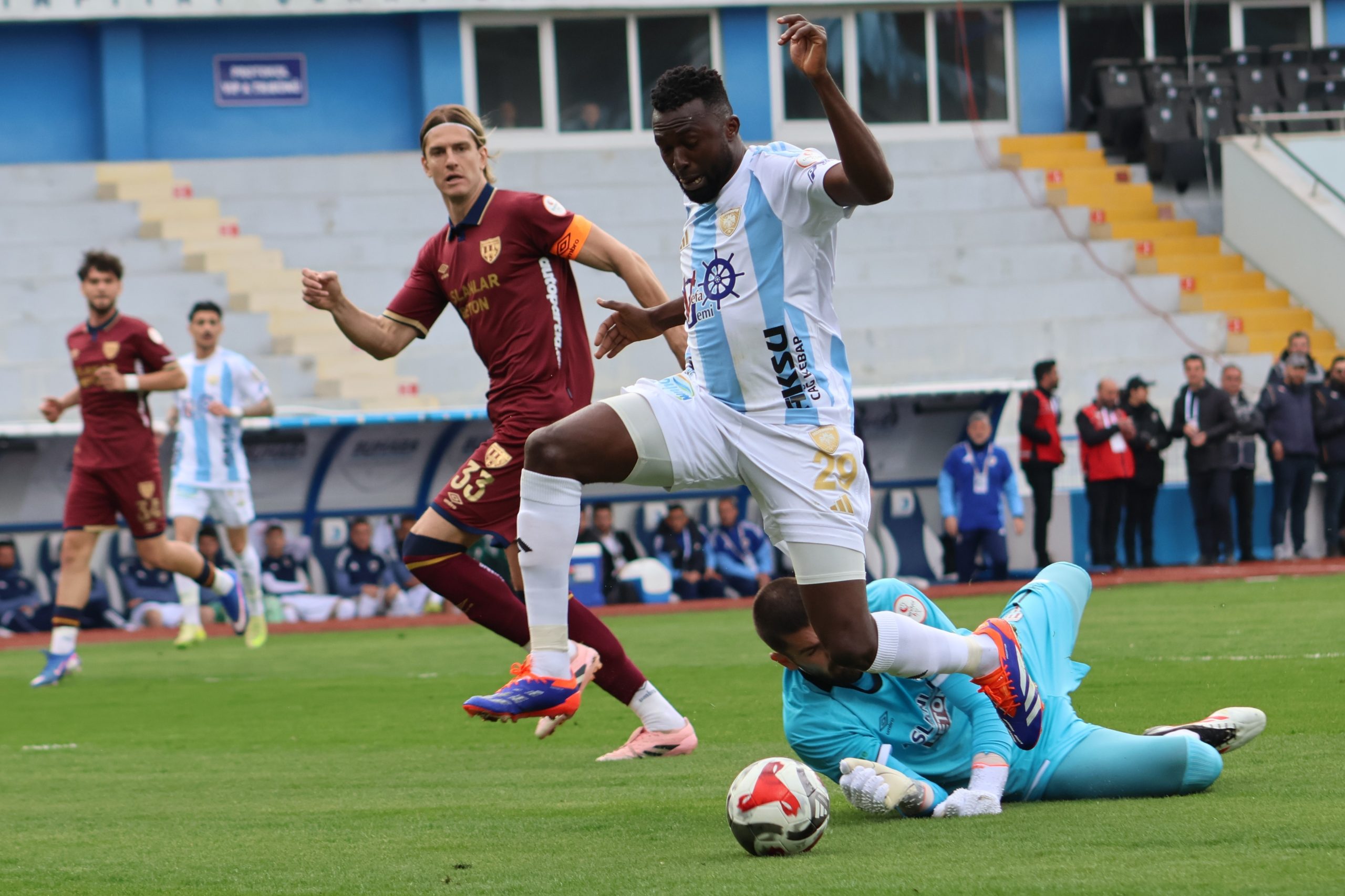 Karşılaşmaya istekli başlayan Erzurum temsilcisi, özellikle ilk yarıda kanatlardan geliştirdiği ataklarla etkili olmaya çalıştı. 10. dakikada Sylla’nın bireysel çabası sonrası altıpas içinde Benhur’un yaptığı kafa vuruşu az farkla auta giderken, tribünler erken bir golün eşiğinden döndü. 29. dakikada ise bu kez penaltı beklentisi vardı. Benhur’un ceza sahasında yerde kaldığı pozisyonda hakem beyaz noktayı gösterdi ancak yardımcı hakemin ofsayt bayrağı kararı değiştirdi.